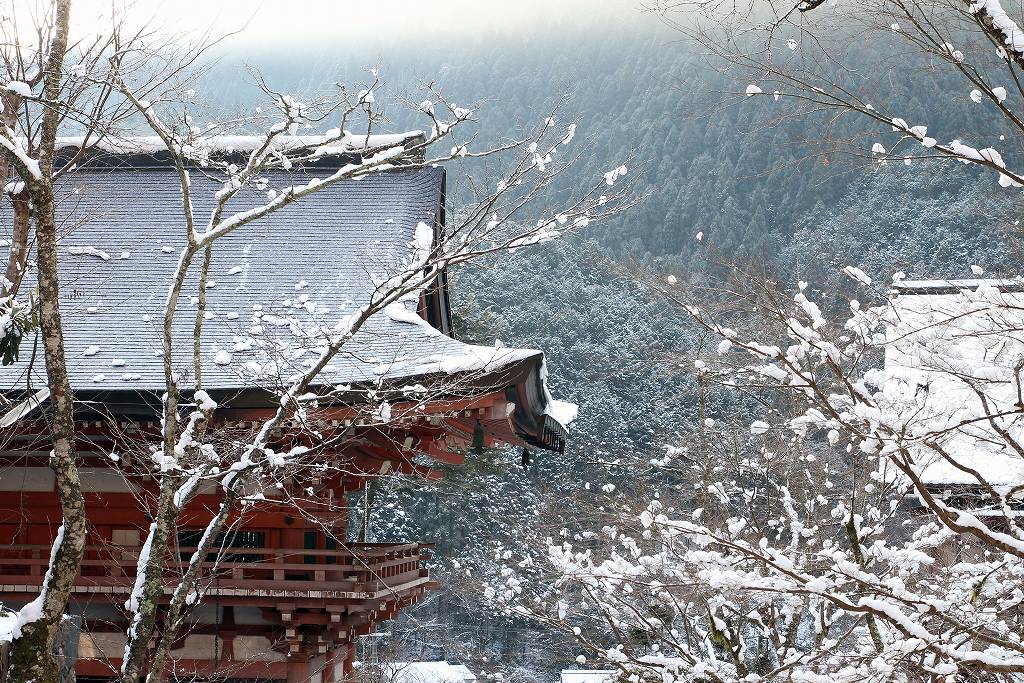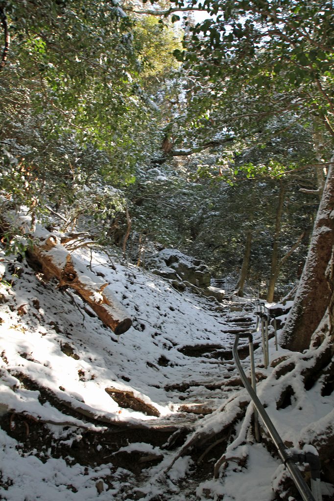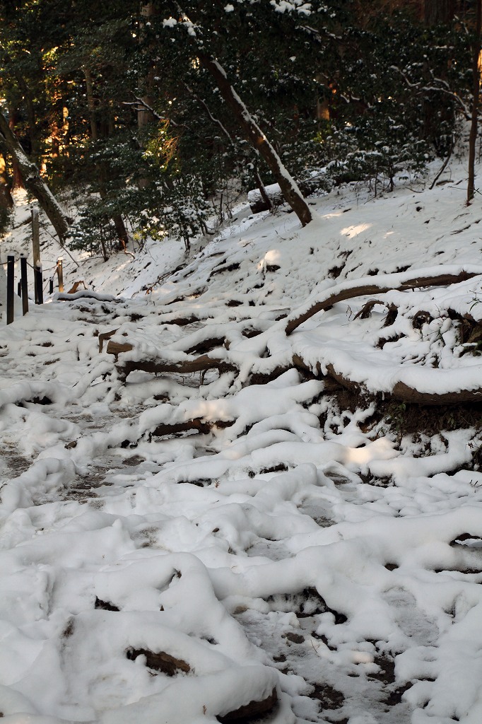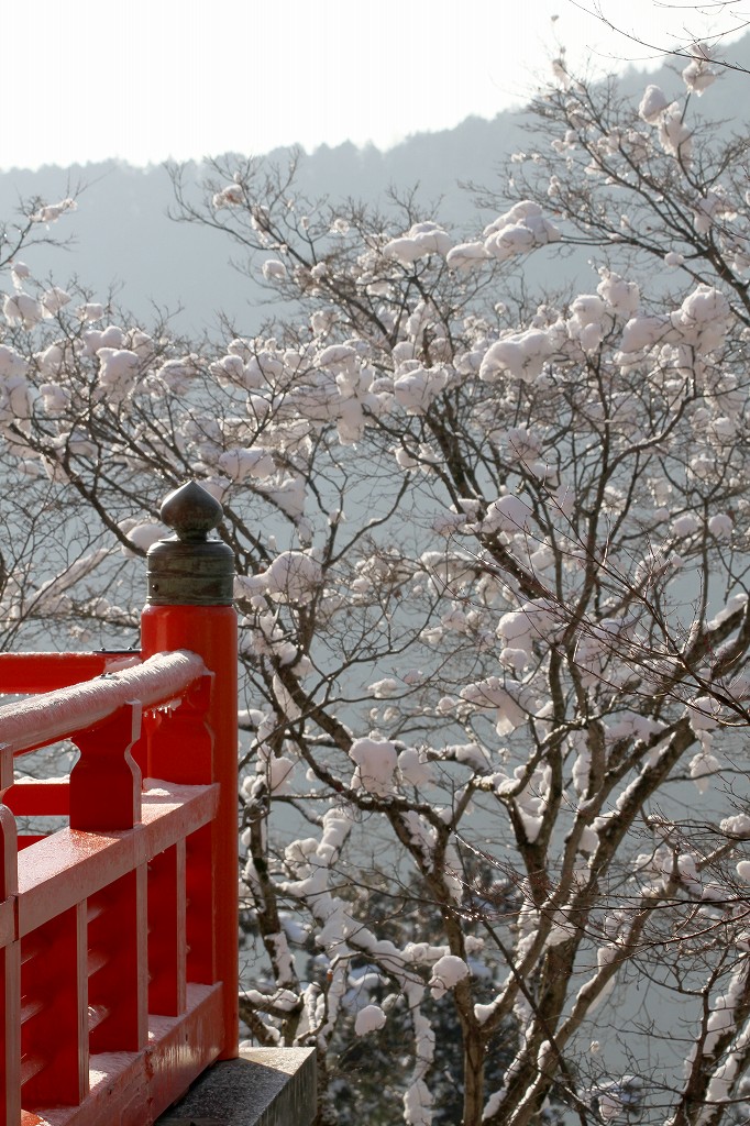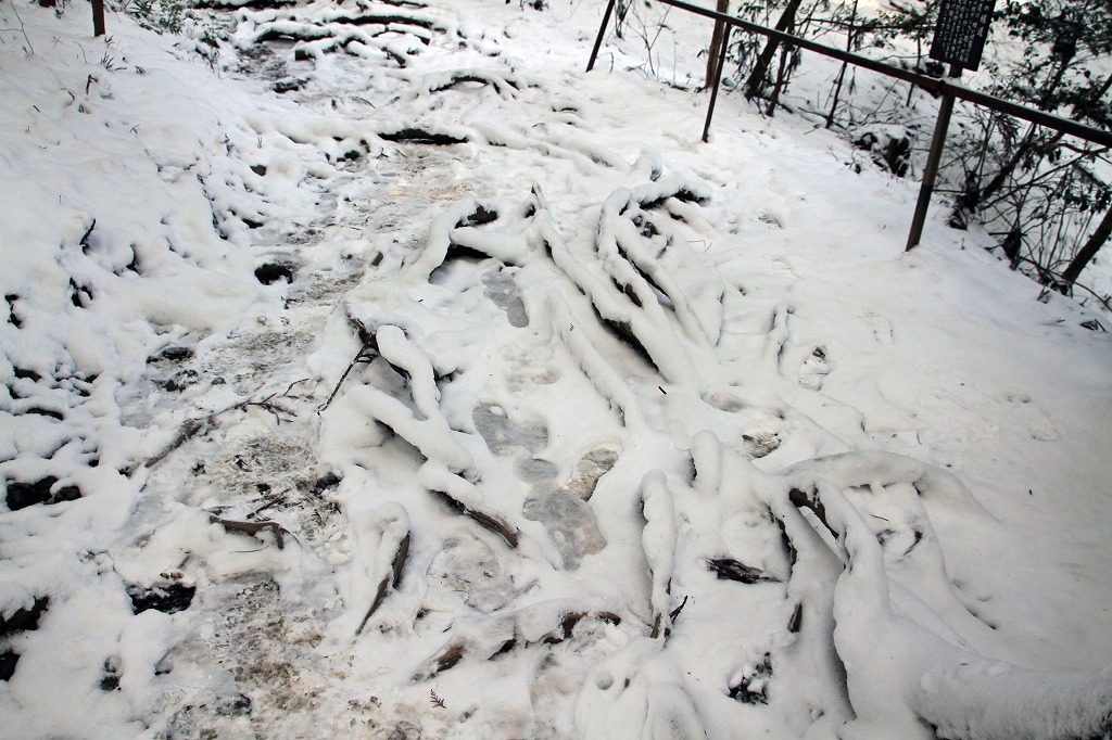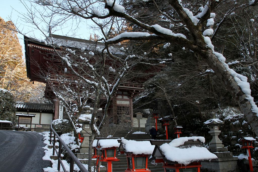 何を思ったか鞍馬山へ雪見。ケーブルを利用して本殿までの予定。絶景で来る値打ちがあった。朝の京都市内は、乾燥していたが叡山電車のニノ瀬まで来ると雪国。これがまたいい。早朝は人が少なく最高。ケーブルで上まで上り、本殿までは良い道で素晴しい。ここで欲が出た。貴船まで行こう。レインシューズで雪道を行進。上りはきつくやっとピークを越え一安心。ところがどっこい下りはアイスバーンで急なこと。すべれば骨折かも。必死に手すりにつかまり気が気ではない。目的の奥の院まで記憶になくなるほどの雪中行軍でした。雪の鞍馬越えは登山のつもりで行くほうが良いでしょう。晴れと雪なら行く価値有りです。