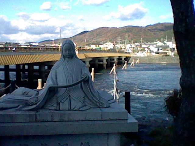 また、橋の手前には正座した紫式部の白い石像があり、橋をバックに、石像と一緒に写真が撮れるいい撮影ポイントです。