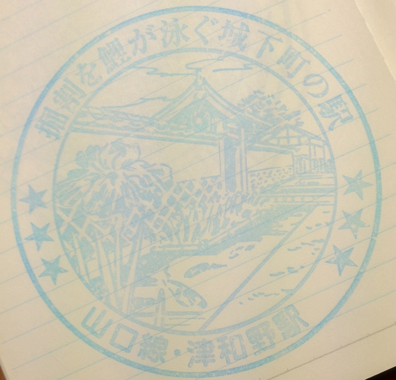 津和野駅のスタンプには、「掘割を鯉が泳ぐ城下町の駅」と刻印されています。