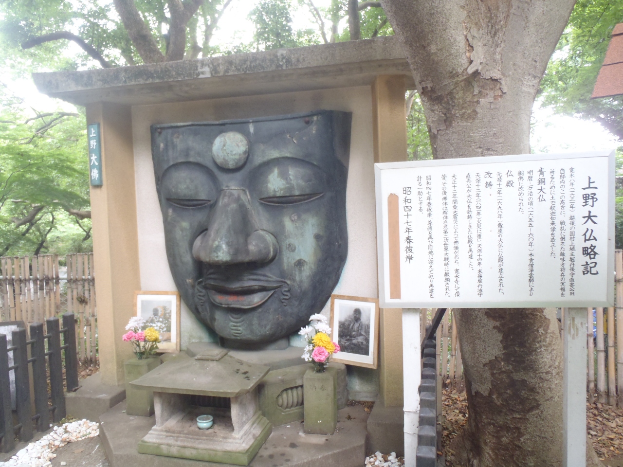 台東区上野恩賜公園内にあった大仏。像 高約6メートルの釈迦如来坐像だった。度重なる罹災により損壊し、現在では顔面部 のみがレリーフとして保存される。所在地は上野精養軒に隣接の大仏山という丘の上にあるのでバリアフリーではないし。