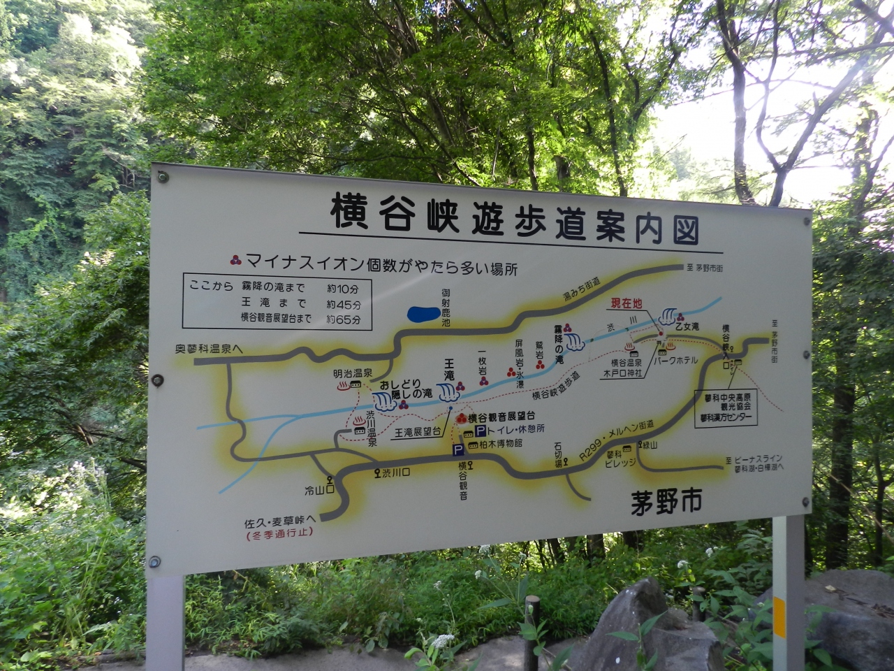 途中、「霧降の滝」「鷲岩」「一枚岩」「王滝」「オシドリ隠しの滝」等の美しい滝や渓流風景を楽しみながらハイキングができるコースとなっています。