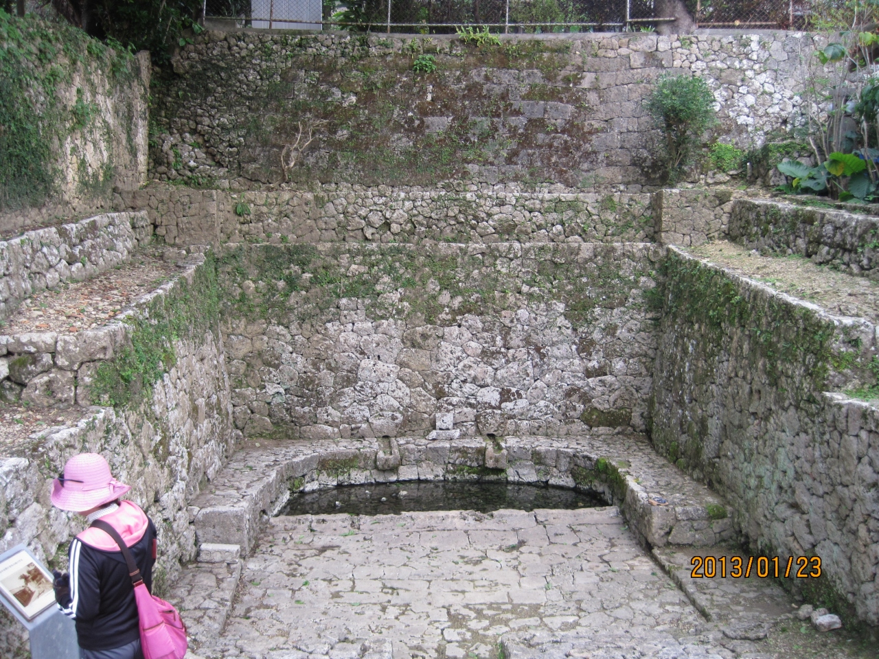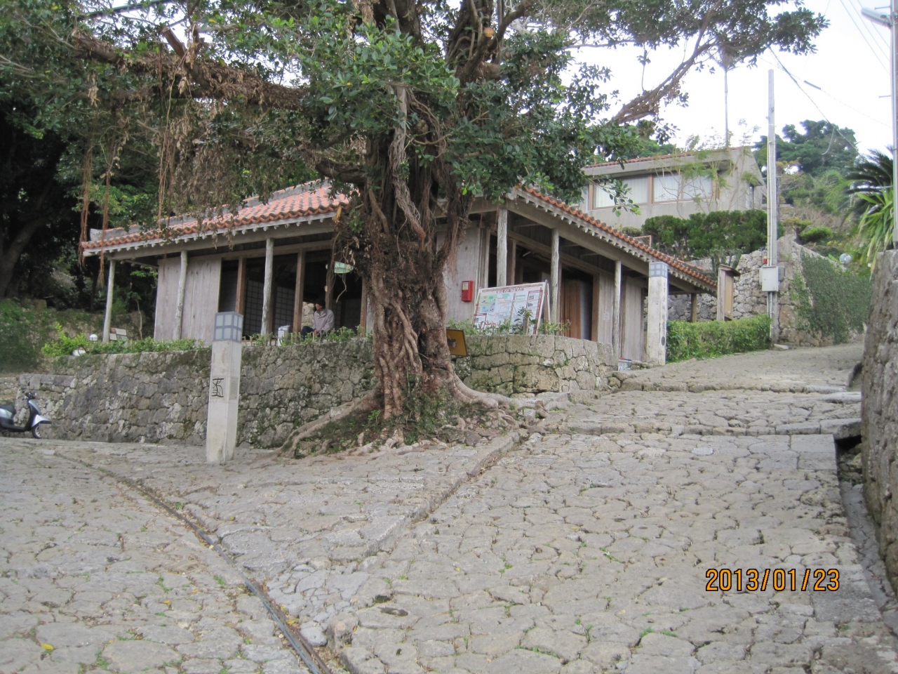 首里城から下って行きました。坂は急ですから、急がなく、ゆっくりと回りをきょろきょろしながら雰囲気を味わって下さい。ただ、足首のねんざや店頭には十分に気をつけましょう。坂の途中には”大あかぎ”などの巨木もあり、少し寄り道をしたり、分かれ道に古い民家や昔の水汲み場などがあります。疲れたら、道端の石に腰を掛けながら歩きましょう。気持ちのいい、石畳の道です。ぜひお勧めです。