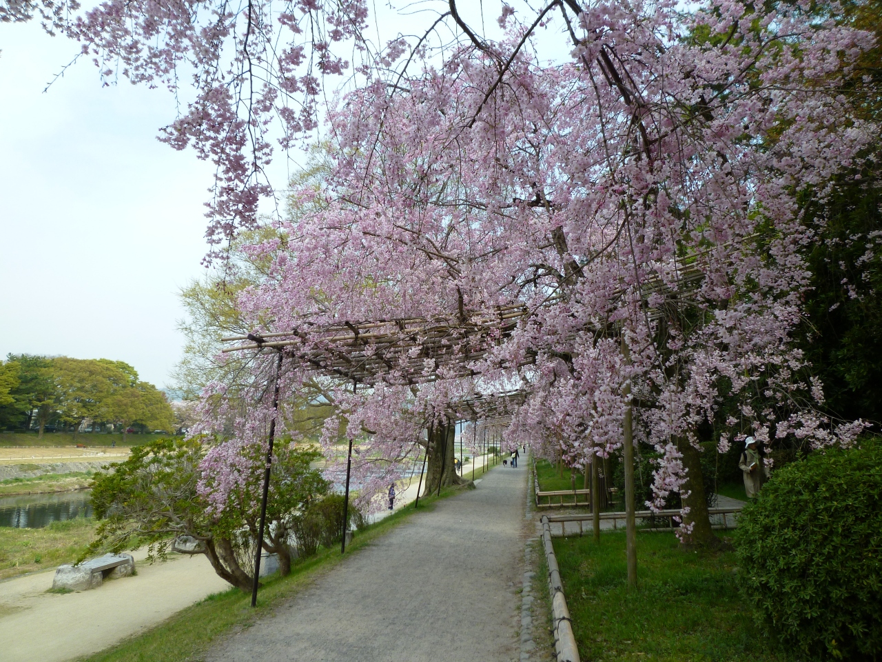 半木の道は、京都府立植物園の西側、鴨川堤防沿いにあります。桜の時期は、北大路通から北山通まで約0.8キロの道は、満開の紅しだれ桜のトンネルの道になります。京都には桜の名所・寺院が他に沢山あるせいか、この半木の道は観光客もそれほど多くはありません。遊歩道も整備されており、鴨川のせせらぎと満開のしだれ桜を見ながらの散策は本当に快適です。