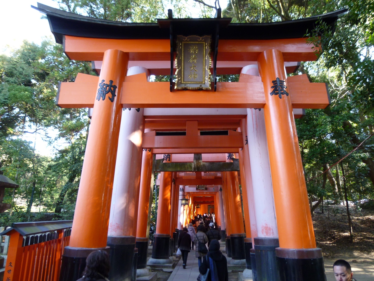 伏見稲荷大社(お稲荷さん)は、全国各地の稲荷神社の総本宮です。参道に続く数千本の鳥居を見たくて訪れました。冬の時期だったにも拘らず週末のせいか、大勢の訪問者がいました。多分、駅から伏見稲荷参道に至るまで続く商店街が目当てなのかも知れません。確かに、数千本の鳥居は偉観だったし、商店街も珍しい食べ物やお土産を売っていてそれなりに楽しかったですが、冬でも物凄い人混みには少々うんざりしました。