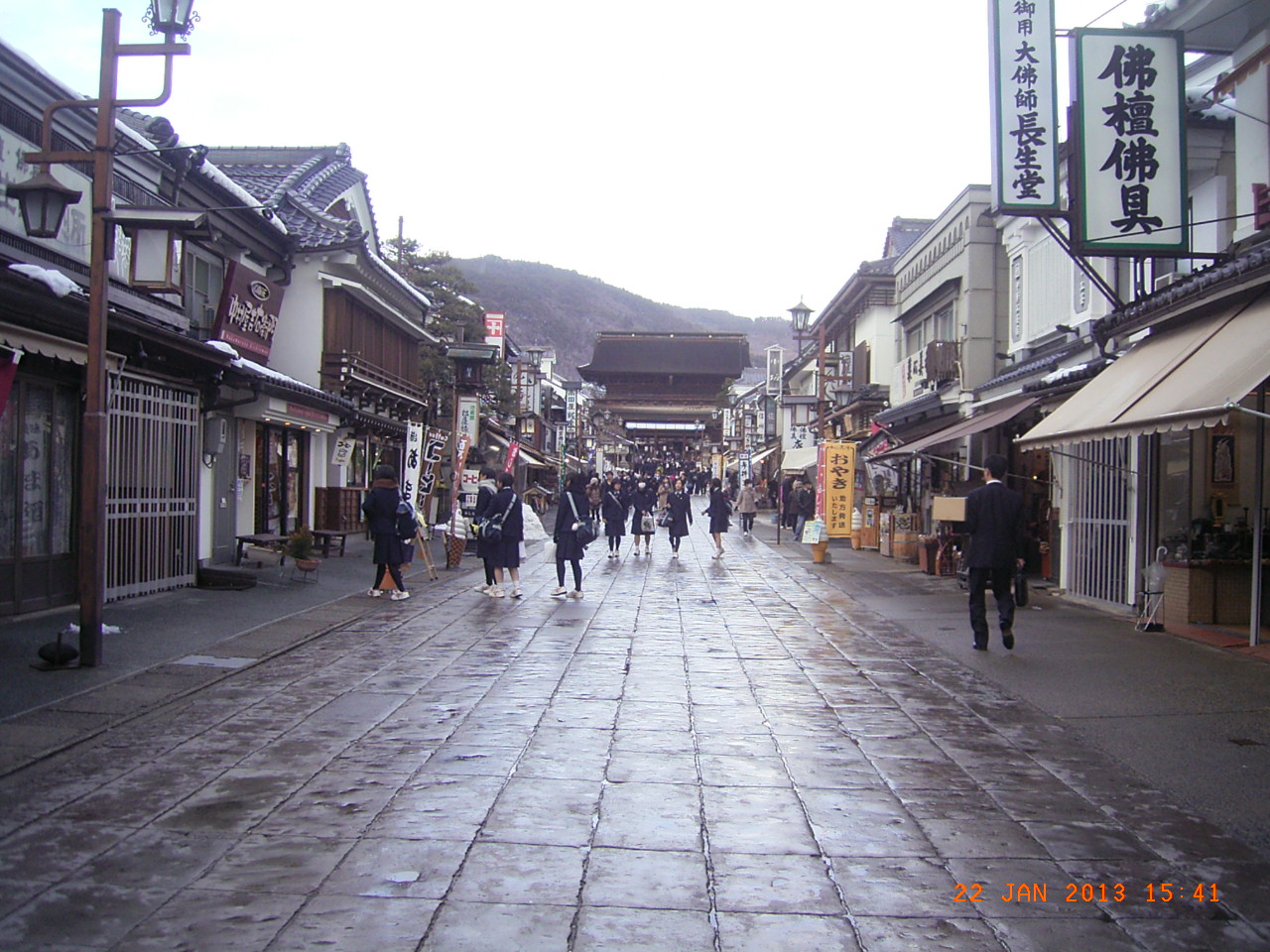 善行寺山門までの参道にある仲見世です。今はお土産屋が多く並んでいます。その中でお寺さんにかかわる店も見られます。そんな店を見つけると立ち入ってしまいます。お土産屋も長野の名産をあつかっています。それも楽しいです。