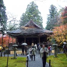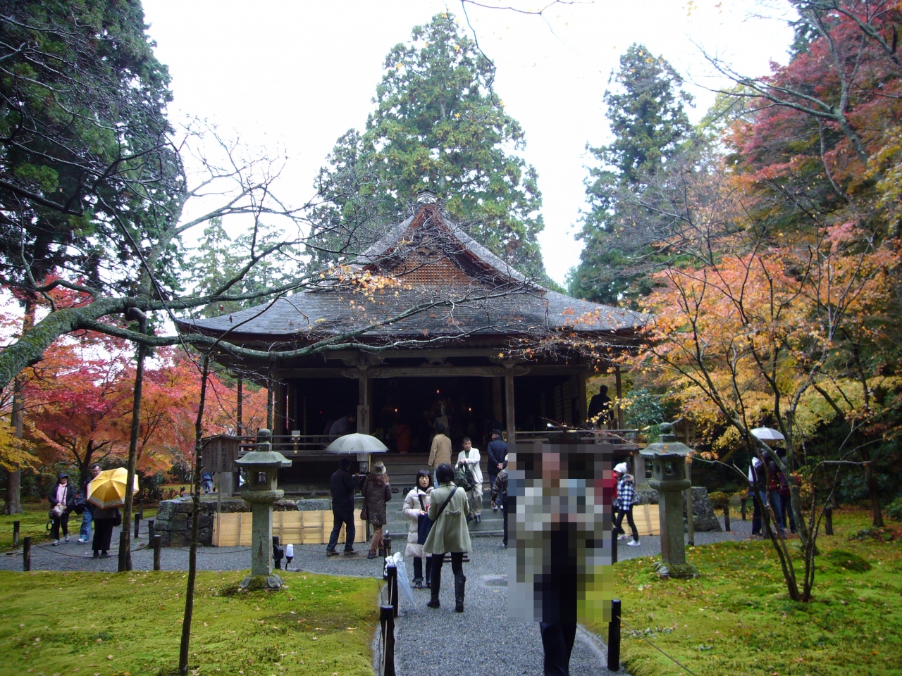 霧雨の中の寺と紅葉もおつなもの。隣の山々も靄でくすんでいる。京都市内は見頃まで、あと1~2週間、三千院はちょうど良い時期だ。