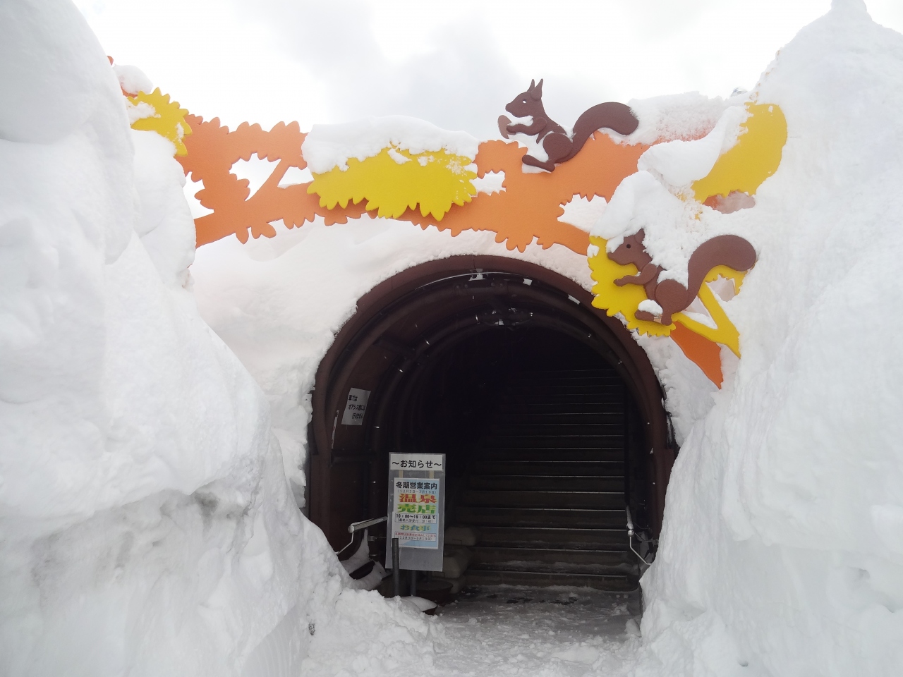 冬はもともとどんな建物なのか全く分からないくらい、雪に埋もれてしまいます。でも、しっかり除雪してあるので、中へは雪の通路を通ってスムーズに入れます。軽食、お土産のほか、温泉施設もあって、時間があればちょっと温泉に立ち寄ってみてもいいと思います。
