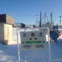 駅名の由来は、アイヌ語の「トワ サ」で羊歯の原、または、「ト アサム」で沼の奥、という意味の言葉からです。駅からいくら探しても海が見えないけど遠浅です。