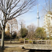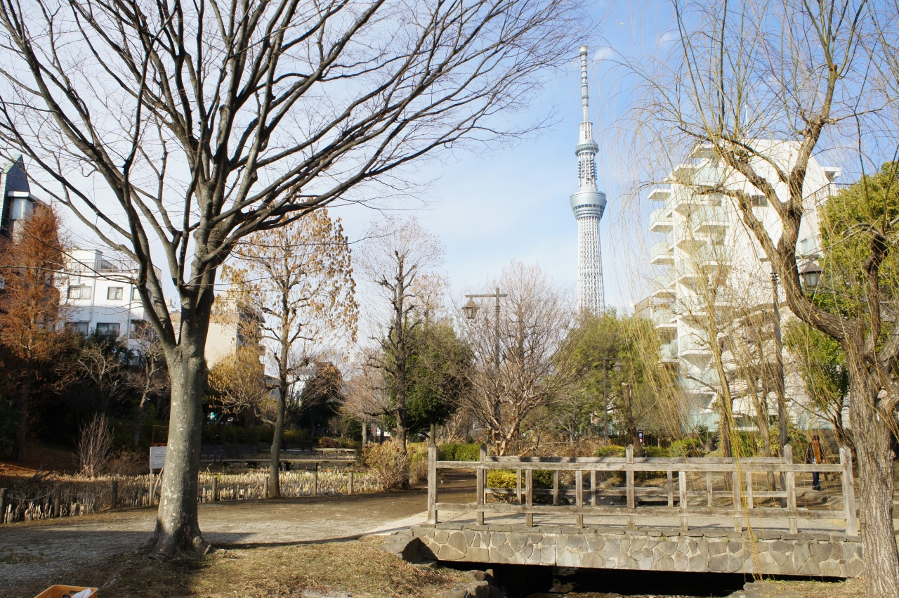 大横川親水公園は、錦糸町駅と両国駅の中間あたり。大横川という川を埋め立てた公園で、総武線と直角にクロスする総延長は約1800メートルの細長い公園です。たぶん、かつてはなんでもない公園だったと思うのですが、ここは東京スカイツリーがいい感じで見える公園となって、写真の河童川原ゾーンとか、絶好の写真スポットになっていると思います。