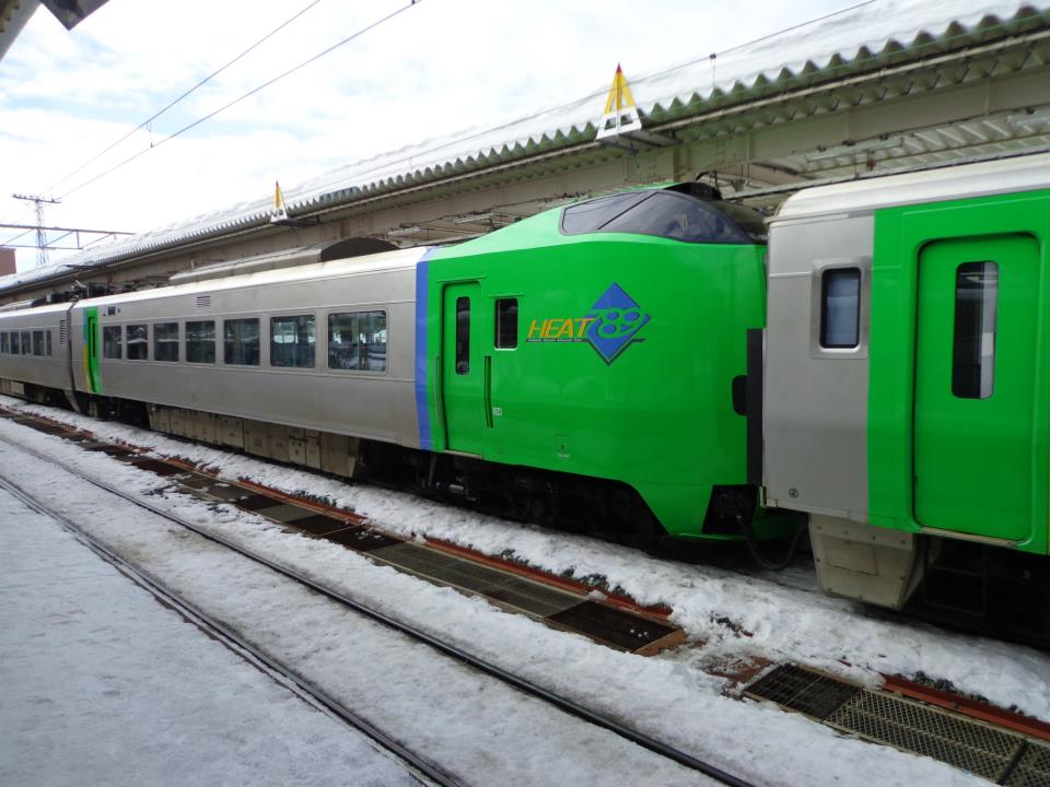 もえぎ色が印象的な「スーパー白鳥」の二連結の列車です。