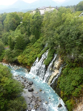 白金温泉から徒歩で歩いたところに青い滝が出現します。温泉の成分?が混じったような青白い川に何本もの白ひげの滝。自然が作り出した芸術です。ゆっくり流れるどうぞお楽しみください。下流には有名な青い池がありますのでセットで見るのもよいと思います。