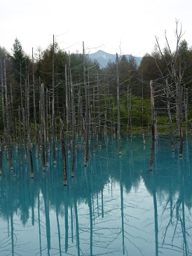白金温泉から少し富良野寄りに青い池はあります。駐車場があまりなく結構駐車場から歩く必要があります。また一部足場も悪いので注意してください。旭岳をバックに少し白みがかった青色。時期により青の濃さが変わるそうです。何度も訪れてみたい場所です。