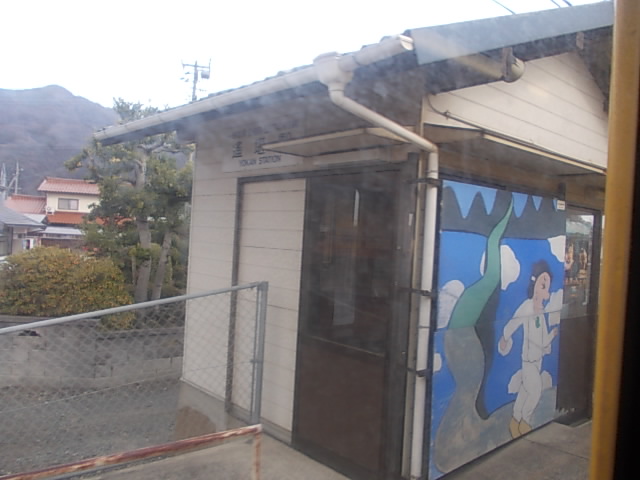 一畑電車沿線の駅らしい、小さな待合所を有するだけの素朴な風情の駅でしたが、この駅は駅名に重みがあって、駅に設置されていた駅名標の風雨に晒された様子もとても味わい深かったです。この辺りの駅の待合所には、神話に因んだデザインがされていましたが、この駅の待合所の柄もとても可愛らしくて微笑ましい気持ちになりました。