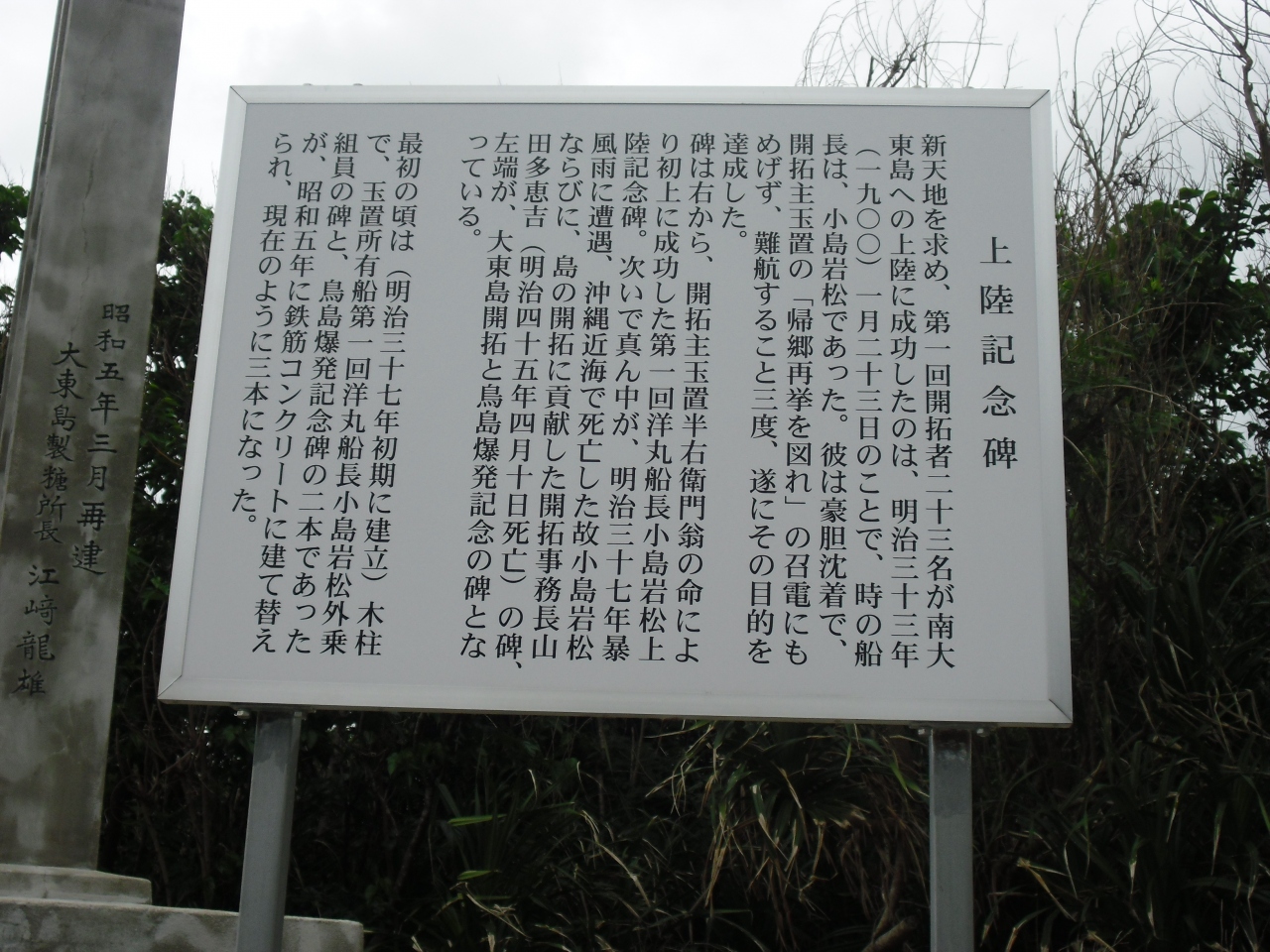 西港へ行く途中の坂の右手にあります。ついでに観ていく程度で良いと思います。3本ほど建っているのがそれです。南大東島に上陸した玉置半右衛門らの記念碑です。上陸したのは西地区の辺りのようです。上陸記念碑だけでなく他に2本別の記念碑も建てられていました。