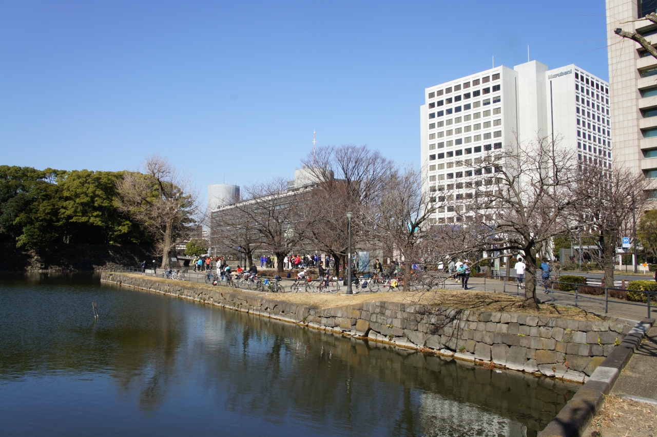 大手濠緑地は皇居の北東のお堀端にある小さな公園。和気清麻呂像があって、これが目印なんですが、和気清麻呂像自体わかりにくいかも。ただ、この辺りで、皇居を走るランナーが準備体操をしたり、お昼だと近所のサラリーマンが休んでいたり。この辺りでは、そうした場所はここだけなので、そういえば、ああ、あそこかなと気付く場所だと思います。