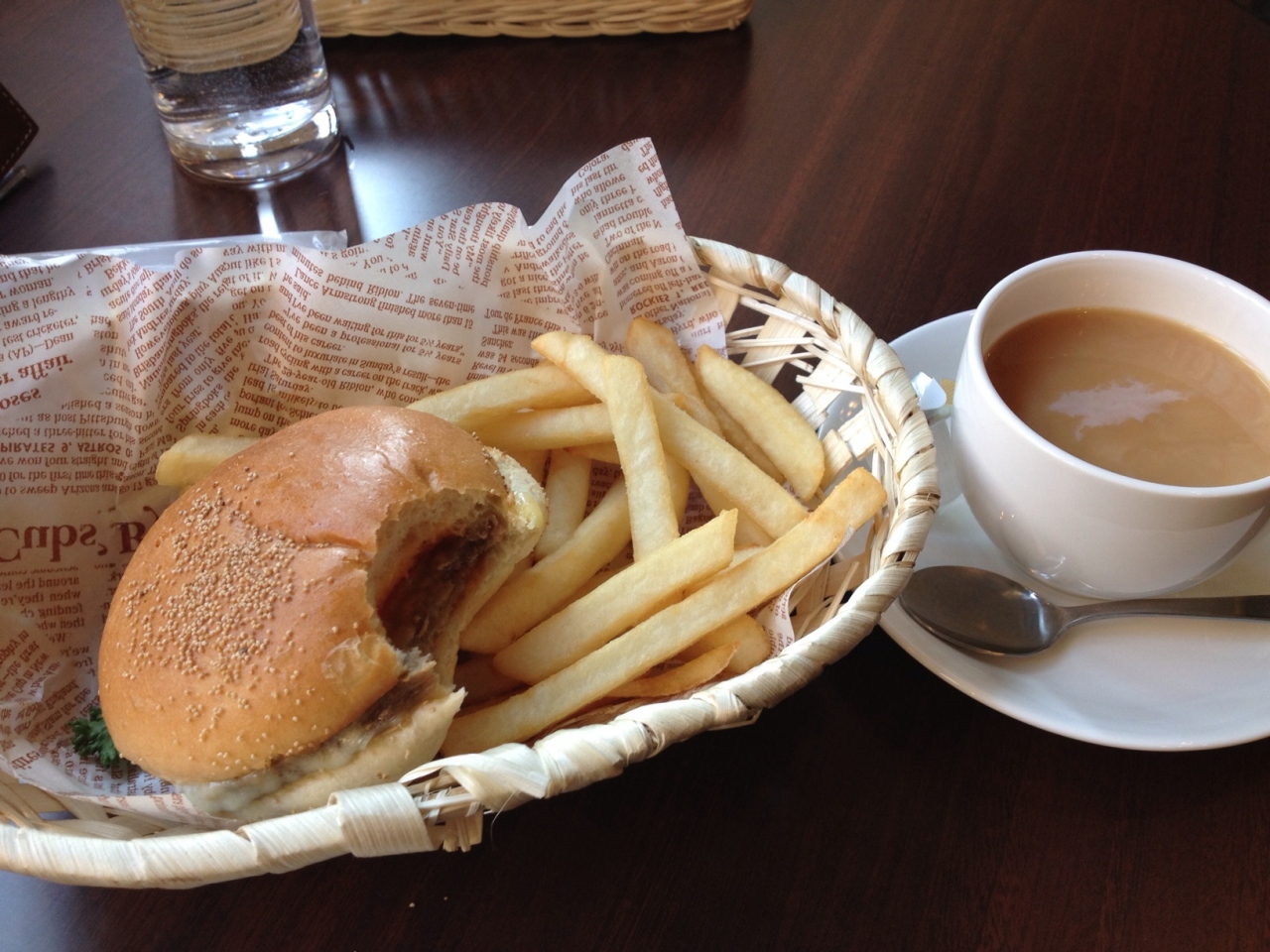 本町でブラブラ歩いているときに見つけたお店です。近辺にもドトール系のゆっくりできるカフェはたくさんあるのですが、ハンバーガーとポテト&ドリンクのセットが500円というお得さに惹かれて入りました。あまり期待していなかったものの、出てきたハンバーガーはチーズたっぷり、ずっしりと重いハンバーガーでびっくりしました。ものすごくリーズナブルだと思いました!夜はスポーツバーなのでモニターがたくさんあり、昼はニュースが流れています。ゆっくりするにはもってこいだと思いました。