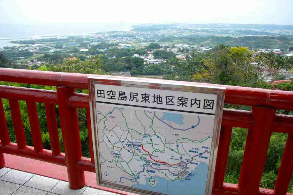 沖縄本島南東部をドライブして回るなら、お勧めの場所のひとつ。南城市玉城の高台にあり、消防署前から直線で伸びる道路だ。途中、展望台があり、そこで車を止めて、一休み。「田空(でんくう)島尻東地区」という一帯を説明してくれる案内地図もある。それをみると、太平洋や本島南部の平地の眺めがよく理解できる。とにかく、眺めがいい。