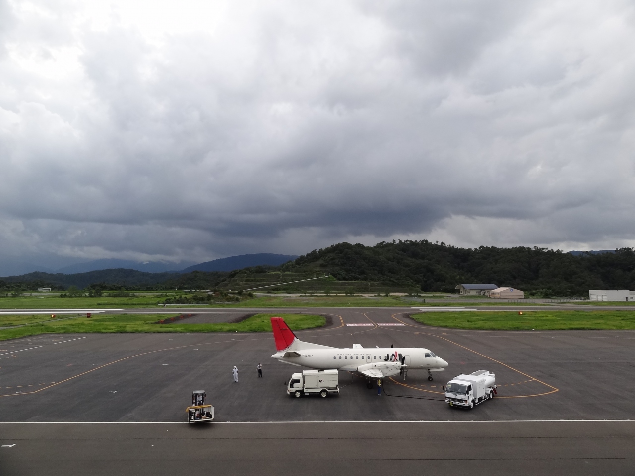 ローカル色の強い、ものすごく小さな空港。丹波地方の空の玄関口、といってもJACは伊丹空港−こうのとり但馬空港を1日たったの2往復。滑走路が短いので大型機材は離発着できず小さなプロペラ機‥機内に預けた荷物は、空港スタッフが台車に積んでせっせと運んでいました。