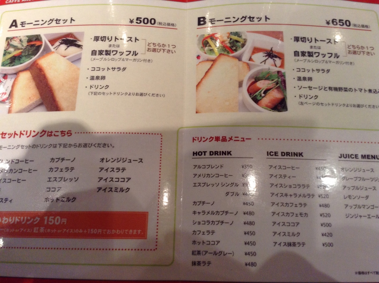 モーニングセットは、メインをトーストかワッフルが選択できます。また写真にあるようにセットのドリンクも選択肢(コーヒー/紅茶/カフェラテ/ココア/オレンジジュースなど)が広い。