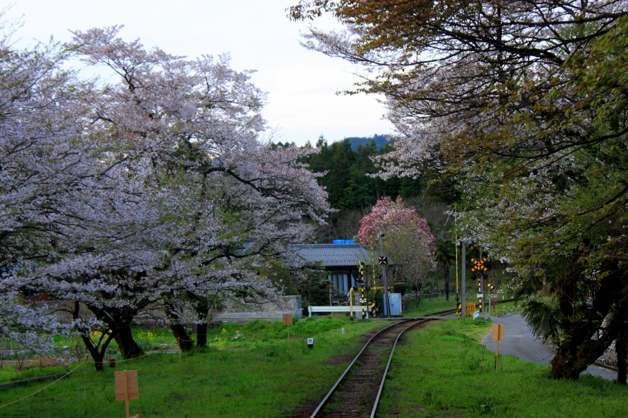 樽見鉄道沿線は桜があちこちで見られ、プラットホームでも桜吹雪が...