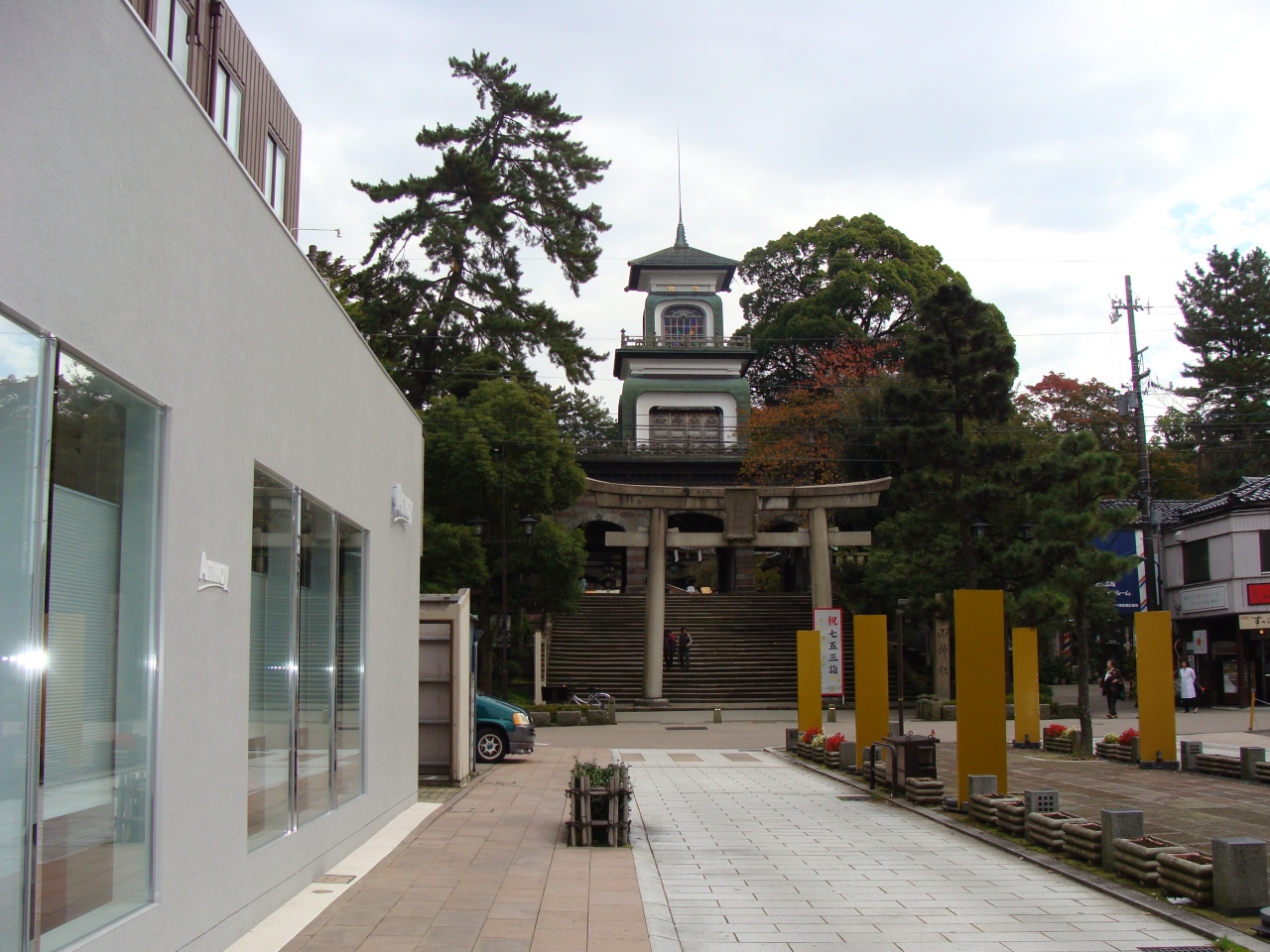とても神社とは思えないステンドグラスの神門です。和洋折衷なのは明治以降に作られたせいなのでしょうか 前田利家を祭ってあるということですが加賀百万石の文化レベルの高さがうかがえます。町のほぼ中心にあり付近の商店街では九谷焼のお店も多かったです。散策にどうぞ