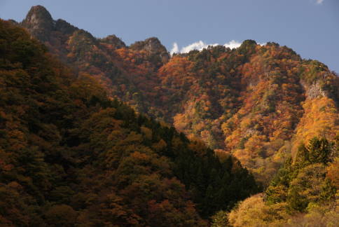 今年の紅葉はなかなかきれいでした。三峰口からの路線バスは平日なのに一杯でした。今年も大滑バス停から出合にかけて歩いて行きました。道中ずっと渓谷沿いのため、見所が続きます。中双里までくると秩父槍ヶ岳のギザギザの稜線が見えます。植林地帯と応用地帯が混ざりますが、不思議とマッチしているように見えます。