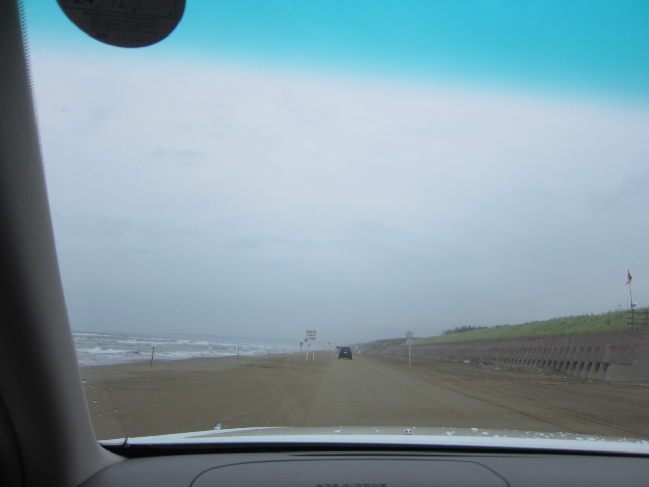 車で砂浜をそのまま走れるという千里浜なぎさドライブウェイ。砂浜でありながら道路標識が設置されていました。この海岸の砂がとても細かく締まっているため、普通の砂浜のように沈まないから走れるとのこと。降りてみましたが、本当に固く、不思議な砂でした。