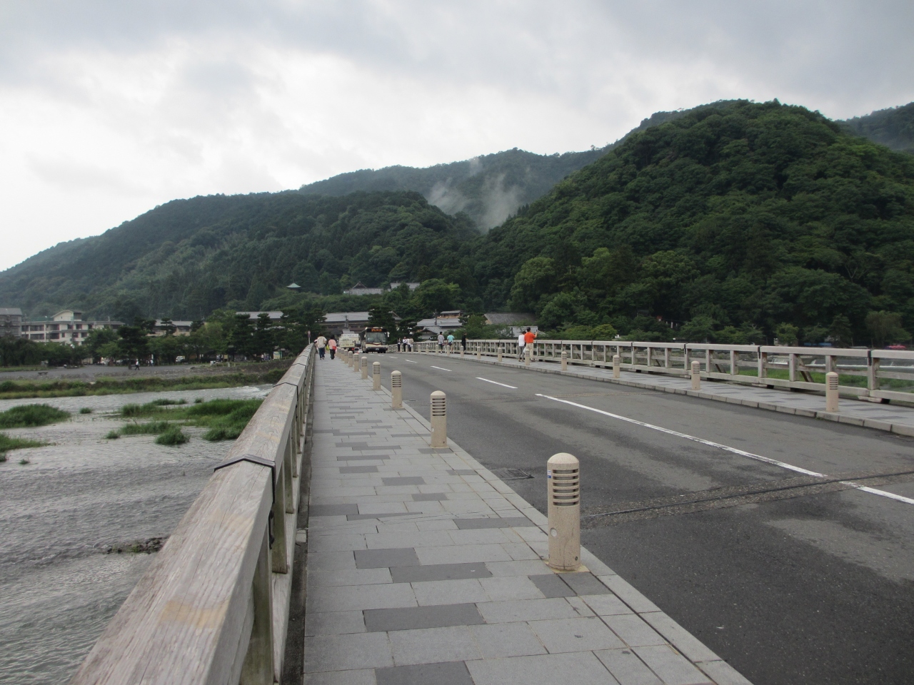 嵐山といったら渡月橋というくらい、嵐山では有名な橋です。人が多いことでも有名ですが、私たちが行ったときはあまり天気のよくない日の夕方ということもあってか、人の行き来はまばらでした。渡月橋の上からみる嵐山の風景、そして橋から離れたところから見る渡月橋のある風景、どちらも見ることをおすすめします。