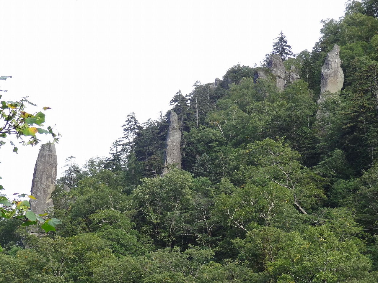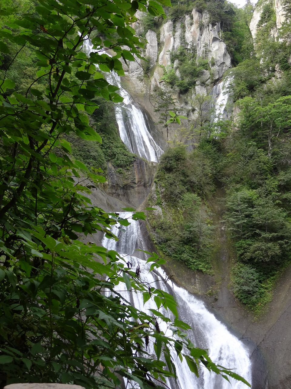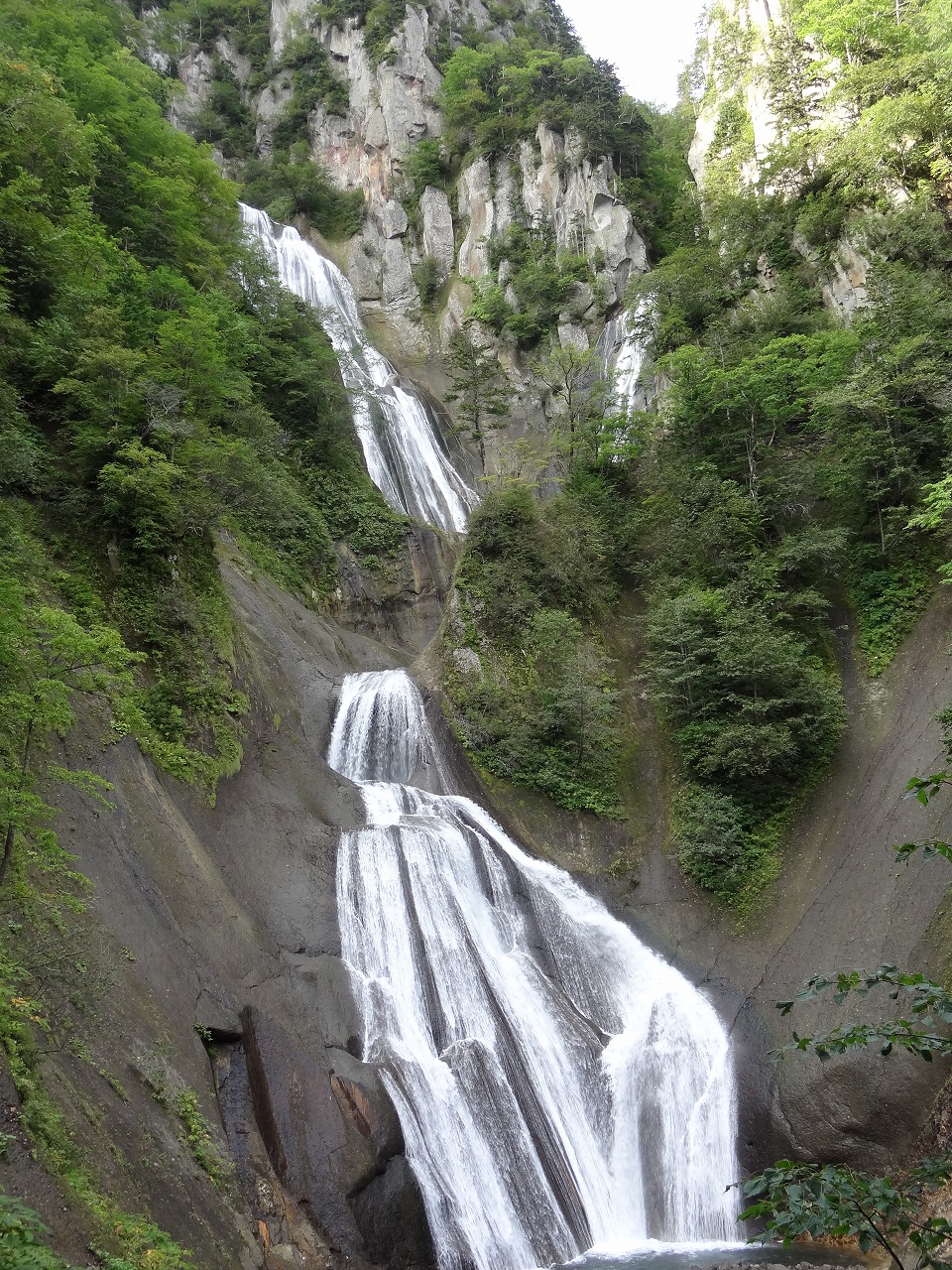 天人峡温泉までバスで行き、そこから左右に柱状節理と呼ばれる不思議な形の岩山を見ながら歩いて10分足らずで観瀑台へ。岩を這うような水の流れは、名前の通り天女の羽衣のような姿で、とても美しい滝でした。
