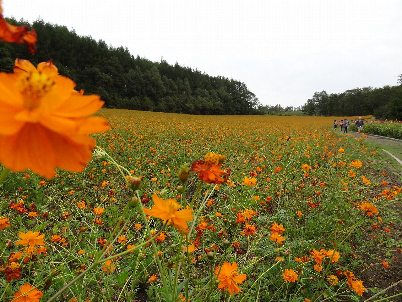 咲いている種類は少なかったけれど、丘一面オレンジのコスモスで、そのスケールの大きさには圧倒されました。さすが北海道です。チョコレートコスモスという変わった品種も咲いていました。