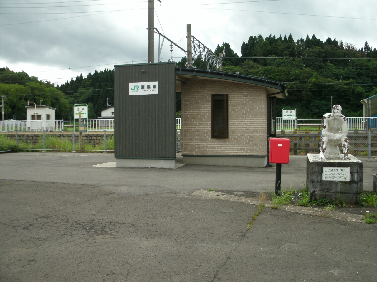 駅の裏を国道7号が走り、踏切を渡って回り込んだところに駅舎があります。駅舎は小さく、待合室の機能しかありませんが、構内は広く、本線らしい駅になっています。駅舎の前、駅前広場にある「考える少年の像」が印象的です。