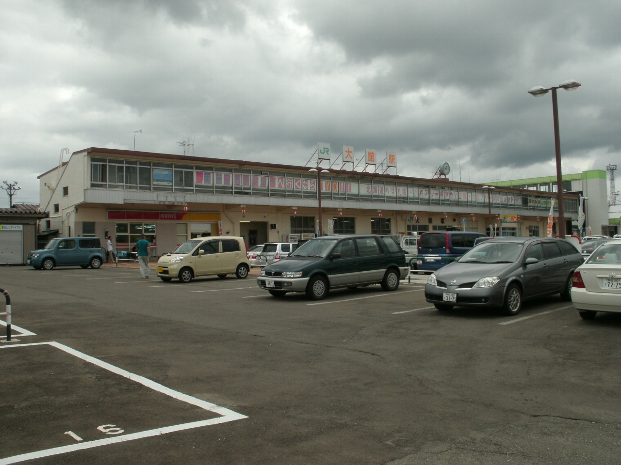 秋田県北部の中心都市である大館市の玄関駅。駅舎も大きく、駅前広場はバスターミナルとしてもにぎわっています。市街の中心には花輪線の東大館駅が近いです。花輪線と奥羽本線の接続駅で、乗り換える観光客も多いです。