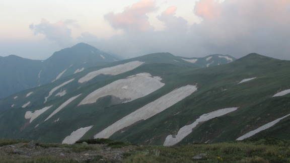 豪雪地帯のため真夏であっても雪渓が多いです。標高がさほど高くないですが、雪渓の近くを通ると大変ひんやりして涼しいです。雪渓の周辺にはお花畑が広がり大変きれいです。特に御西岳近くが大変きれいですのでお勧めです。