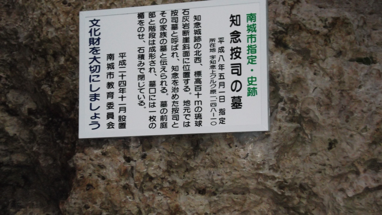狭い道で坂の途中に駐車場が現れ、そこから坂を下り城の敷地に入ると右手にノロの居住跡が有り、すぐに地形を利用した石垣が現れる。見どころは世界遺産の城とは違い現在も修復作業中と思われる。そこから按司の墓まで起伏の有る整備されていない狭い道を抜けると崖があらわれる。通路と思われるところを登ると崖下に按司の墓になる。洞窟の入り口に石を積み上げて蓋をしたような明らかに人工的に作られたと思われる。ただ足元が悪く滑りやすいので注意が必要