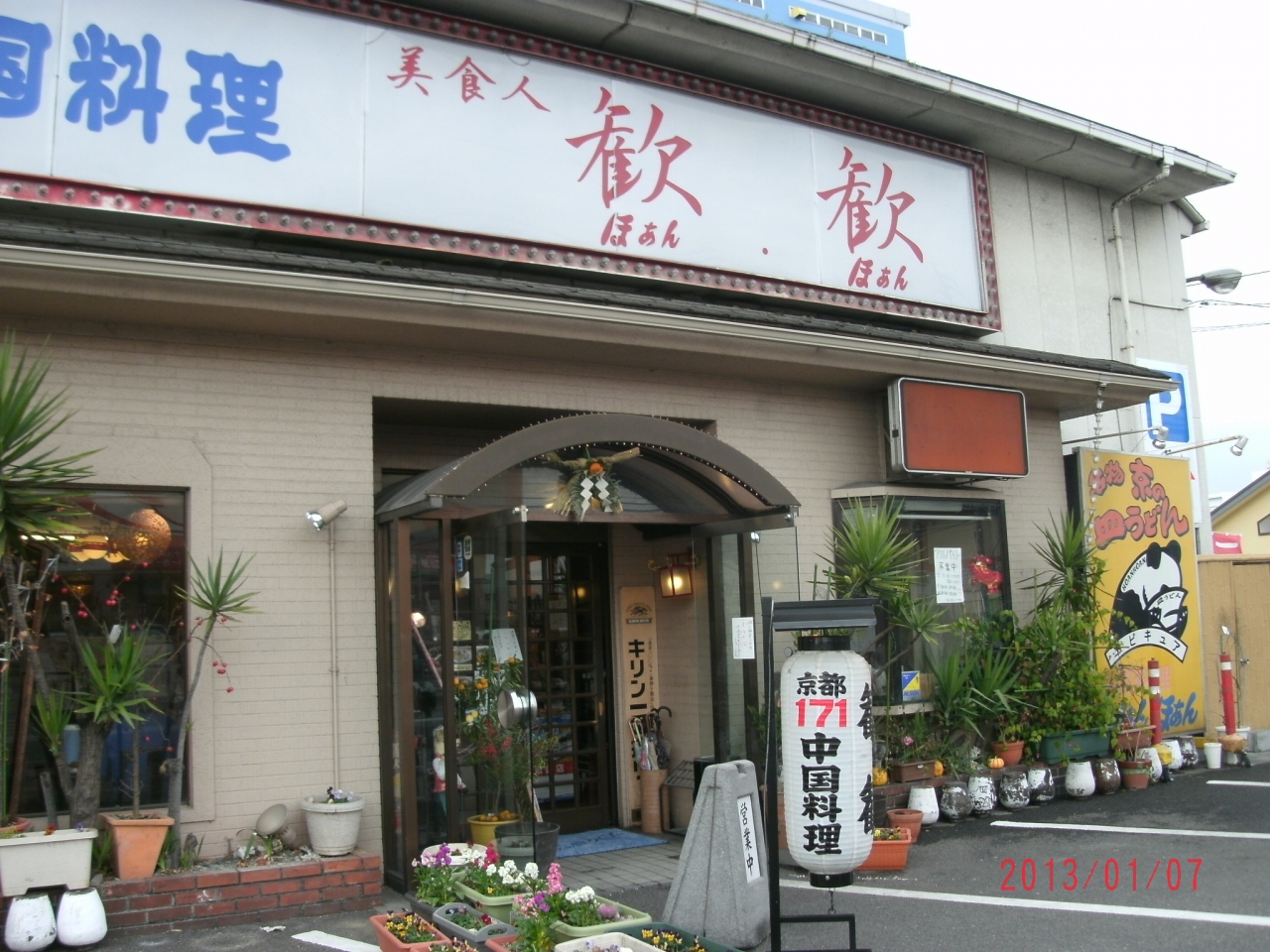 「歓歓 」さんは、向日市の国道171号線沿いにあります。大きなパンダの看板が揚がっているので、それを目印にすれば判りやすいと思います。お店の構えは、いたって普通の町の中華屋さんと言う感じですが、創作中華料理や麺・飯類から点心までメニューも多く、本格的な中華料理を味わえる店として知られています。名物の“京のさらうどん”など、単品もお奨めですが、私が気に入っているのは“美食人コース 2,700円/人)”で、内容は時期によって異なりますが、スープ、前菜、魚介・肉、麺または焼き飯、デザートなど一通りコースとして頂けます。料理も総て本格的なものだし、ボリューム的にも価格的にも納得できるものです。当日、お店に入ってからでも注文できるのでお奨めします。