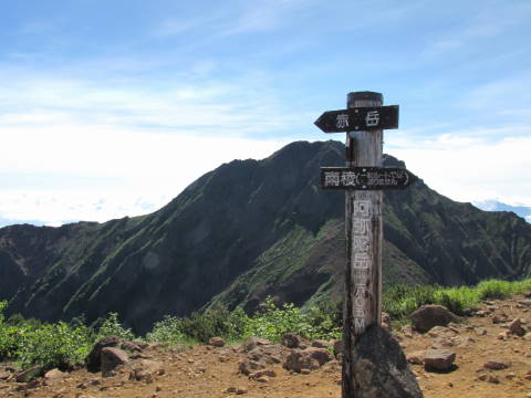 百名山の赤岳に比べて訪れる人はだいぶ少なくなります。頂上からは中岳越しに赤岳が良く見えます。登山ルートはいくつかありますが、今回利用したのは行者小屋からのルートで稜線にあがると登山道沿いの崖に高山植物がたくさん咲いていてきれいでした。