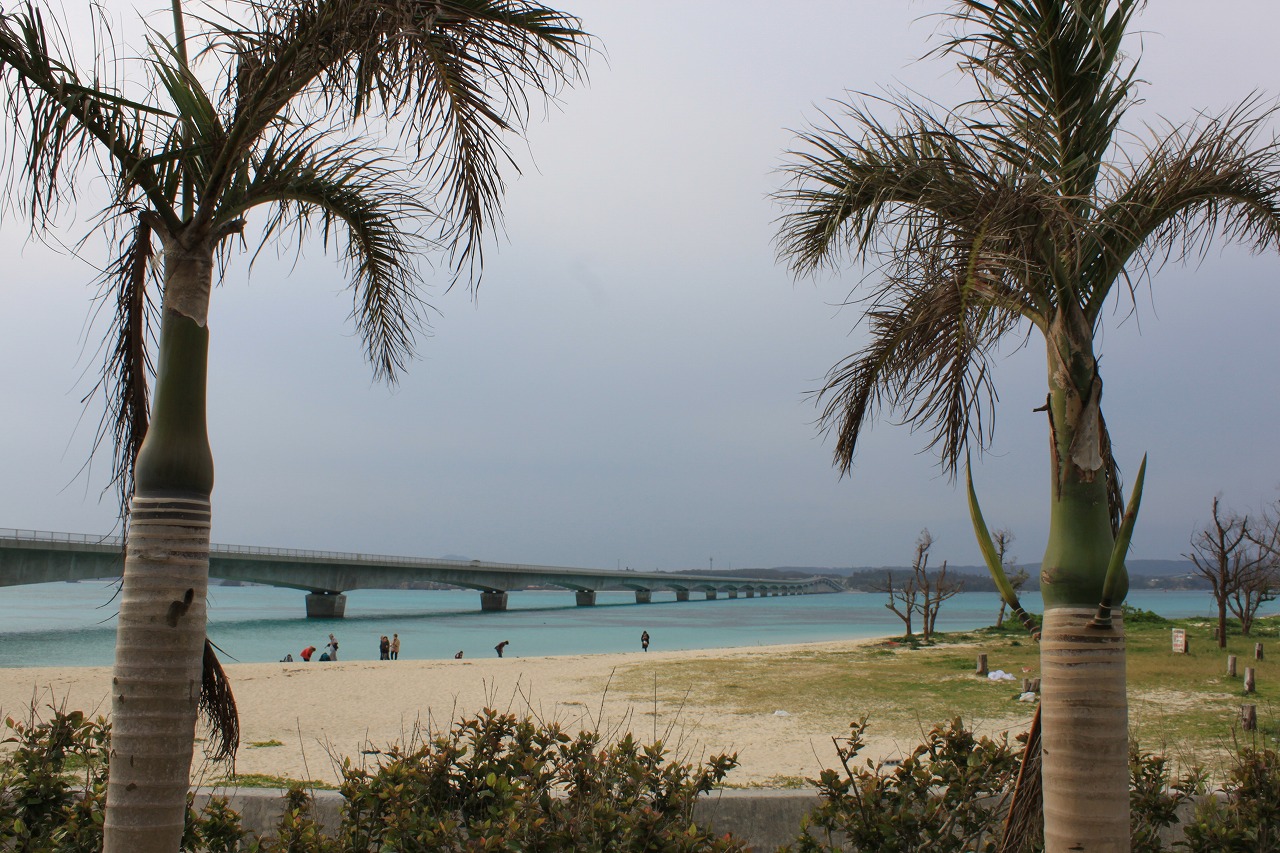 ’13年1月27日にレンタカーで行って来ました。この日はあいにくの天気でしたので青空とコバルトブルーの海は眺められませんでしたが、ロケーションは最高です。ワルミ大橋ができたせいかアクセスが良くなり、団体の観光客がたくさん来ていました。そのため古宇利島側のふれあい広場からではなく、橋の手前にある屋我地島の公園に車を止めて、橋を眺めるのもよいと思います。