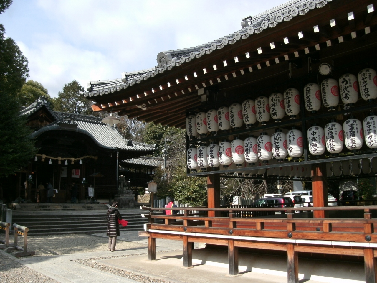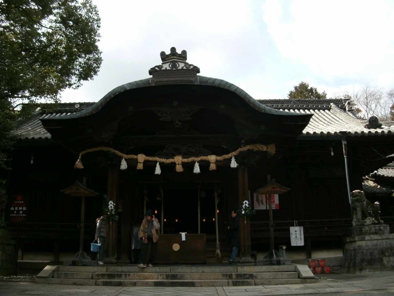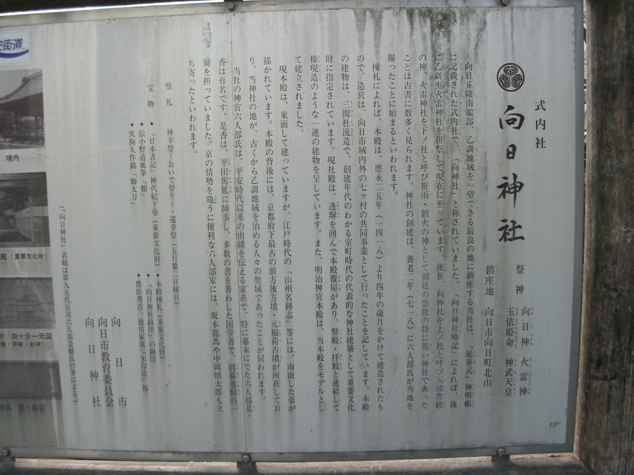 「向日神社」は、阪急京都線西向日駅より、北西に歩いて約15分のところにあります。地元で“明神さん”の名で親しまれている養老2年(718年)創建の古社で、應永25年(1418年)に建造された本殿は、室町時代の三間社流造という建築様式で国の重要文化財に指定されています。向日神社の大鳥居から長い石畳の参道を上がって行くと本殿にいたります。参道の両側には桜並木があり、春には桜祭りが開催され、多くの市民が花見を楽しみます。