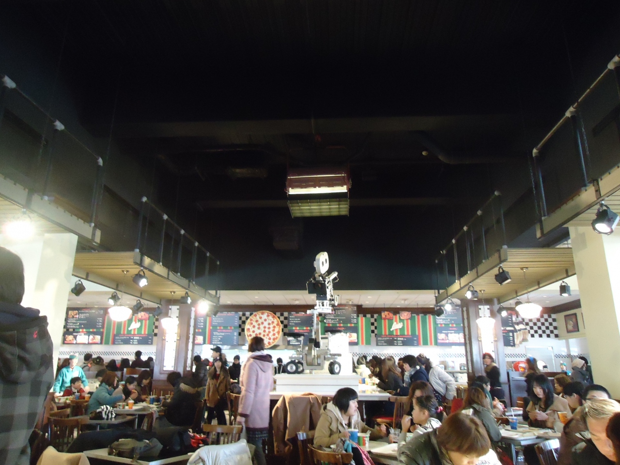 ユニバーサルスタジオ内にあるピザとパスタ屋さんです。昼に行きました。中は広く結構たくさんのテーブルがありますがほとんどが埋まっていました。マクドのようにカウンターで注文してテーブルに持って行く方式です。注文に行く時は先にテーブルをキープしてから注文をしにいった方がいいです。