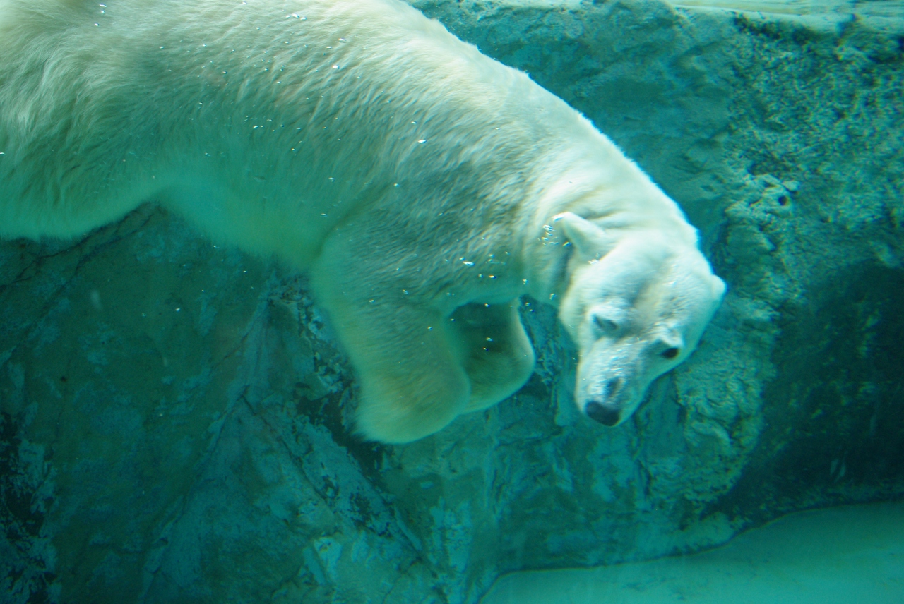 オットセイが筒の中を泳いでいたり、白熊が水槽に飛び込んできたり、ペンギンが泳ぐところを水面の高さから見れたり、猿が頭上を移動していたりと。