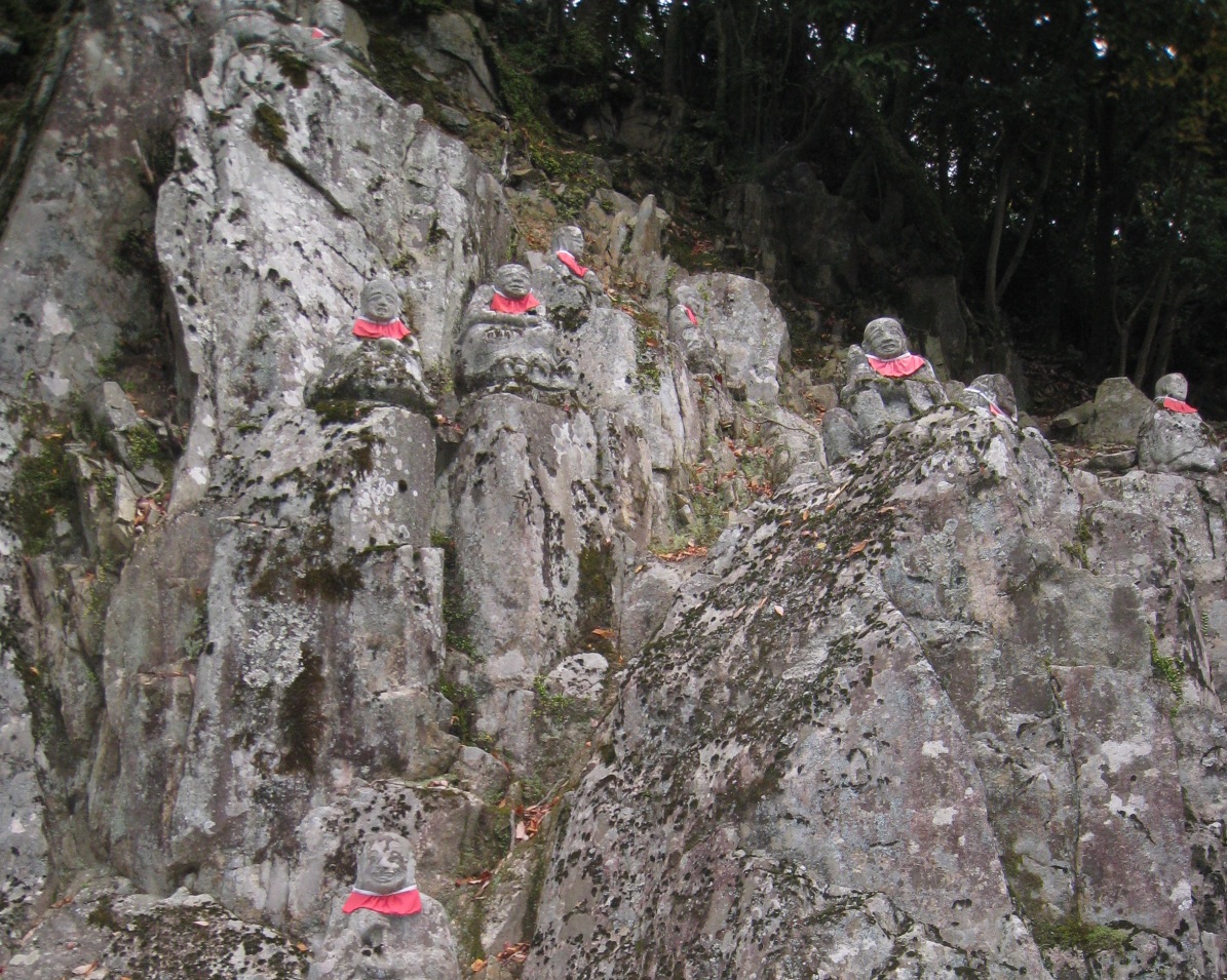 参道には、十六羅漢像があり、岩にたくさん安置されていました。