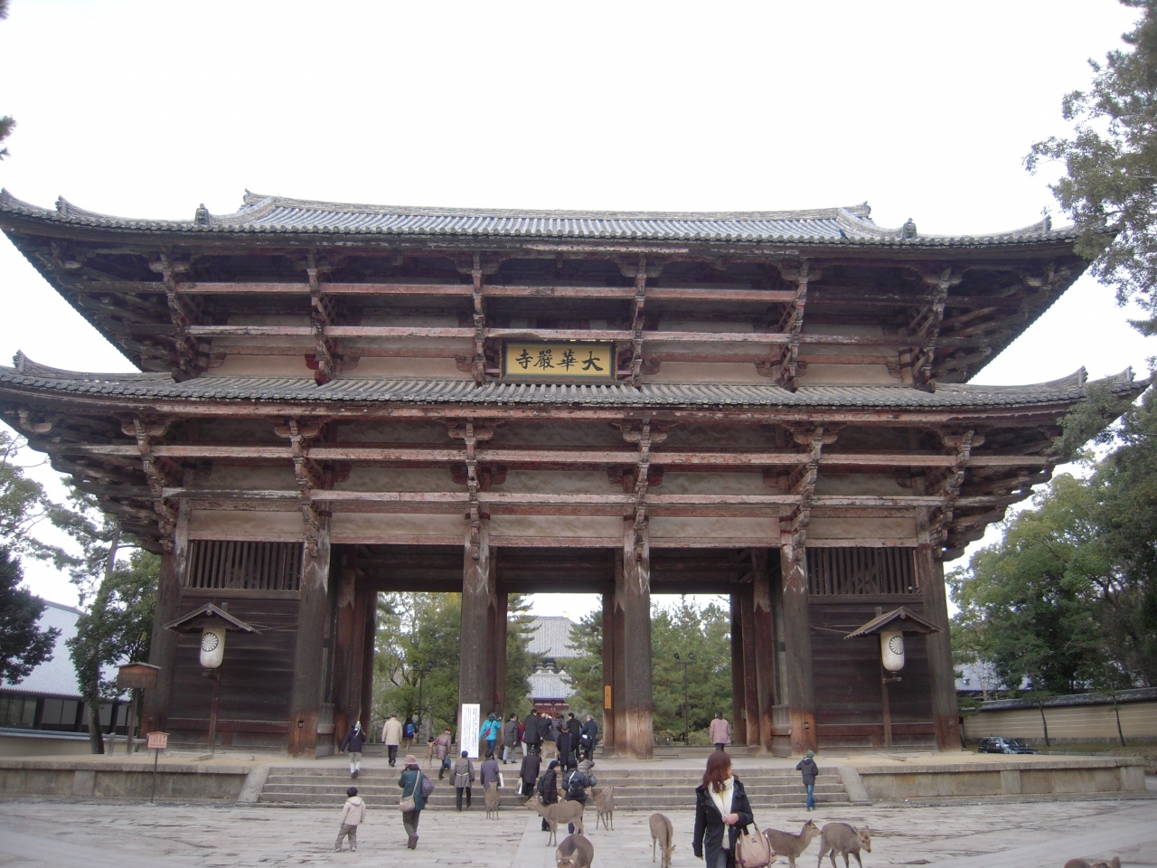 東大寺に向かう参道にそびえる南大門は遠くから見ても大きいのですが、その近くに立つと本当に大きい門で両側に安置されている金剛力士像も迫力があります。この辺りはおみやげ物屋さんが軒を並べて大変賑わっていました。鹿も多くて、鹿せんべいを売るお店もありました。道には鹿の糞も多いので注意が必要です。