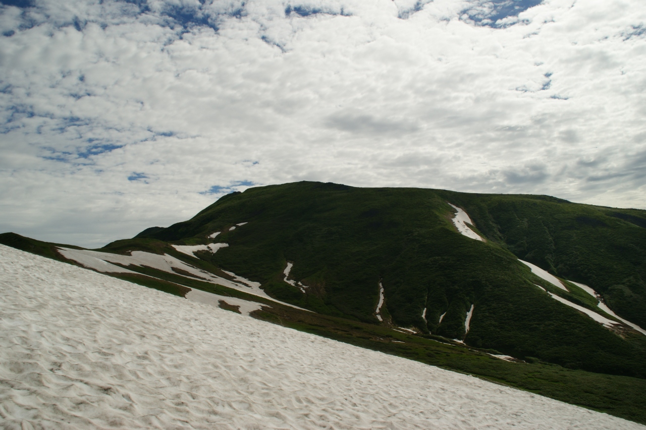 雪の残っているところは軽アイゼンが必要と思います。隣では夏スキーを楽しんでいるスキー客もいました。最後の急登が結構厳しかったけど良い山行でした。