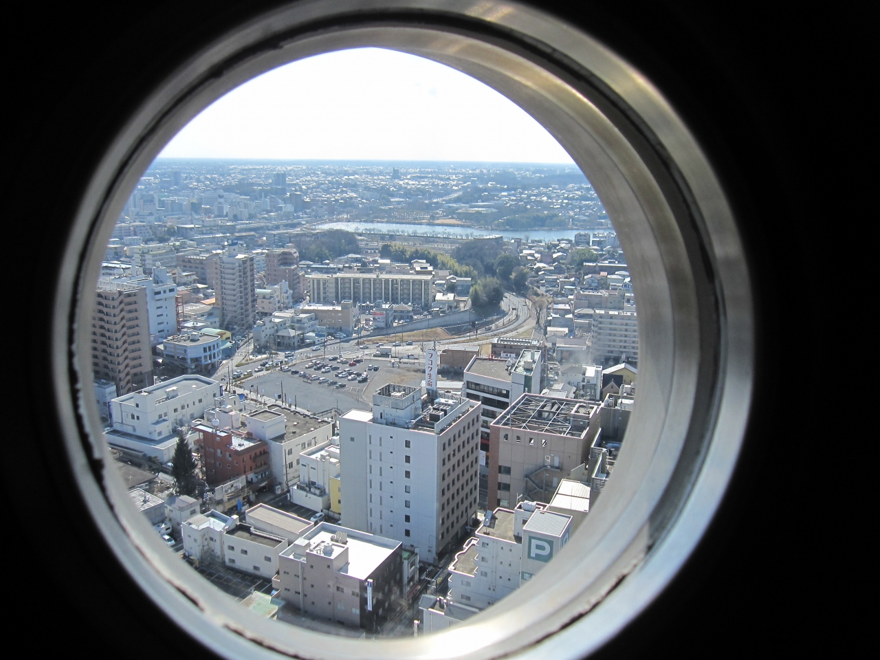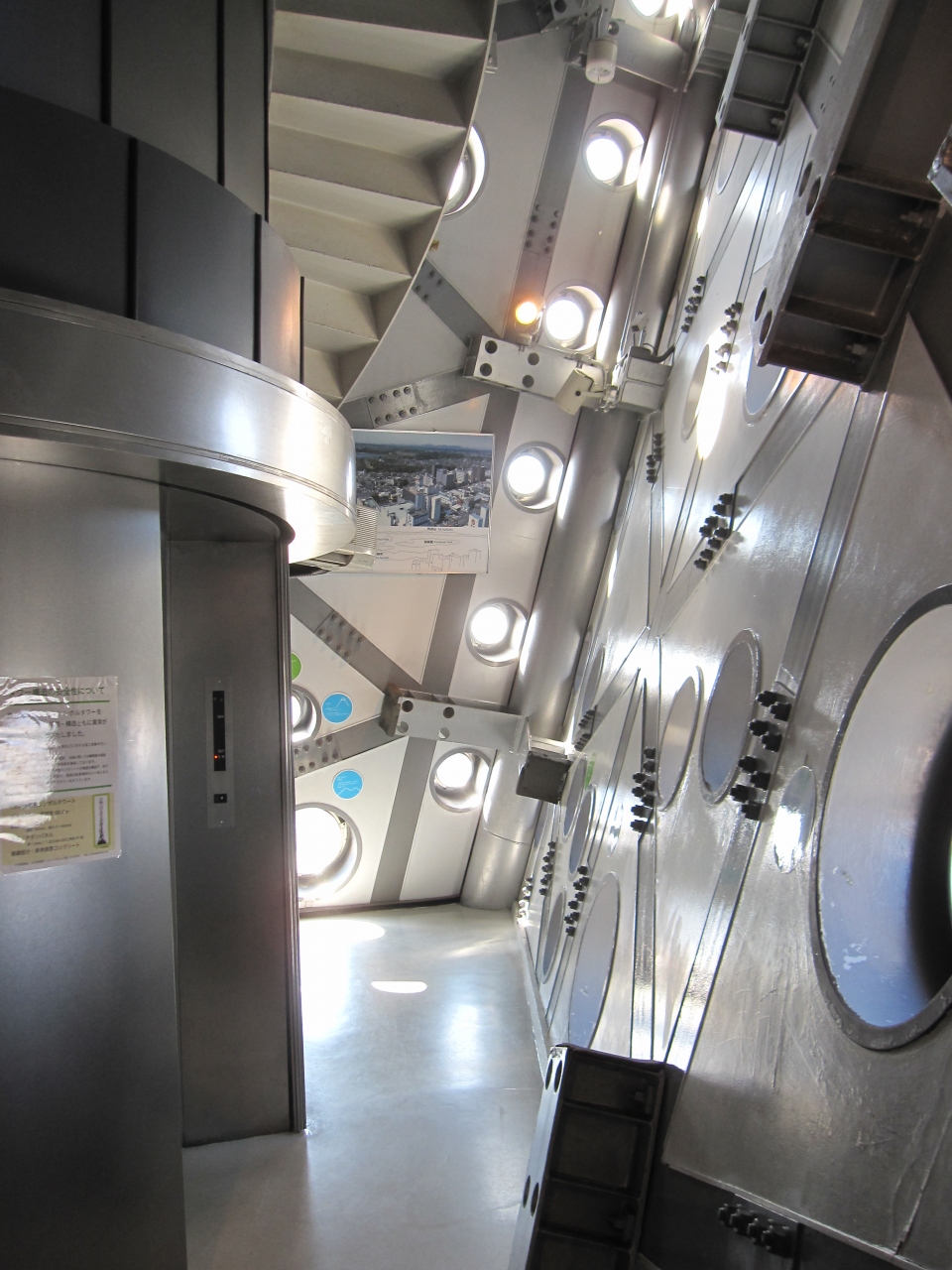 高さ100メートルのタワーにも登れます(入場料は200円)。展望台にいくエレベーターが透明なのは内部の複雑な構造を見てもらいたいから、だそうです。上からは小さな丸い窓から外を眺めます。展望台というと全体がひらけたイメージがあるのですが、限られたスペースから外を覗くのも珍しく面白い体験でした。