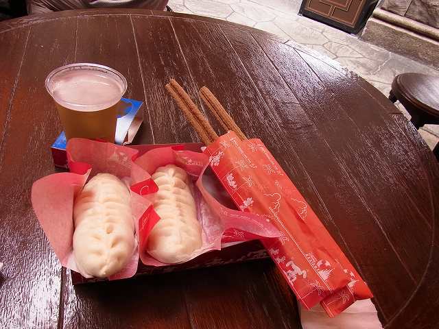 食べたのはディズニーシー名物のギョウザドッグとミッキーチュロス。ギョウザドッグは餃子の形をした肉まんですね。なんでドッグというのかは不明ですが(笑)。なお、ハロウィーン期間以外は、ギョウザドッグはここでの販売ではないそうです。
