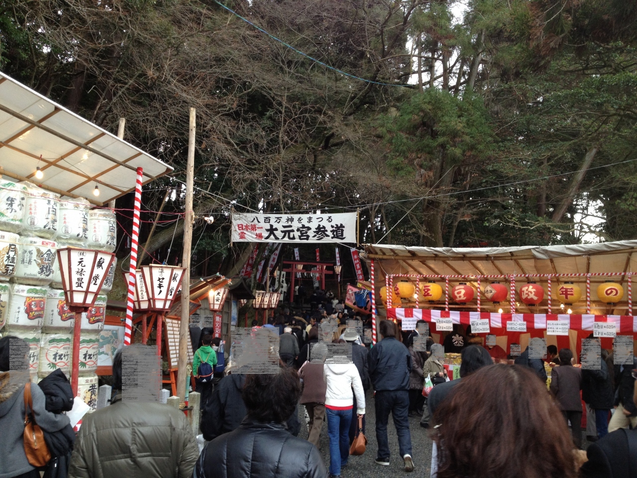 そんなに大きな神社ではありませんが節分発祥の地として有名らしく、「大元宮」といわれるところまで登ると全国の神様が一同に集められています。屋台も東山通りの手前からたくさん出ていました。境内で福豆を買うと景品が当たる抽選もあるようでした。