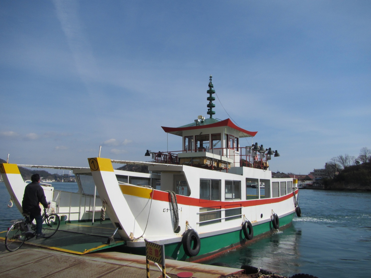 尾道と向島とを隔てる海は「尾道水道」と呼ばれ、この水道には渡船航路が3本運航されています。尾道側から見て、西側から、尾道駅前渡船・福本渡船・尾道渡船です。料金は福本渡船が60円、他は100円です。駅前渡船は、向島で川を上っていくので、少し時間がかかります。駅前渡船と福本渡船の航路は交差しているので、船のかわしあいが絶妙です。