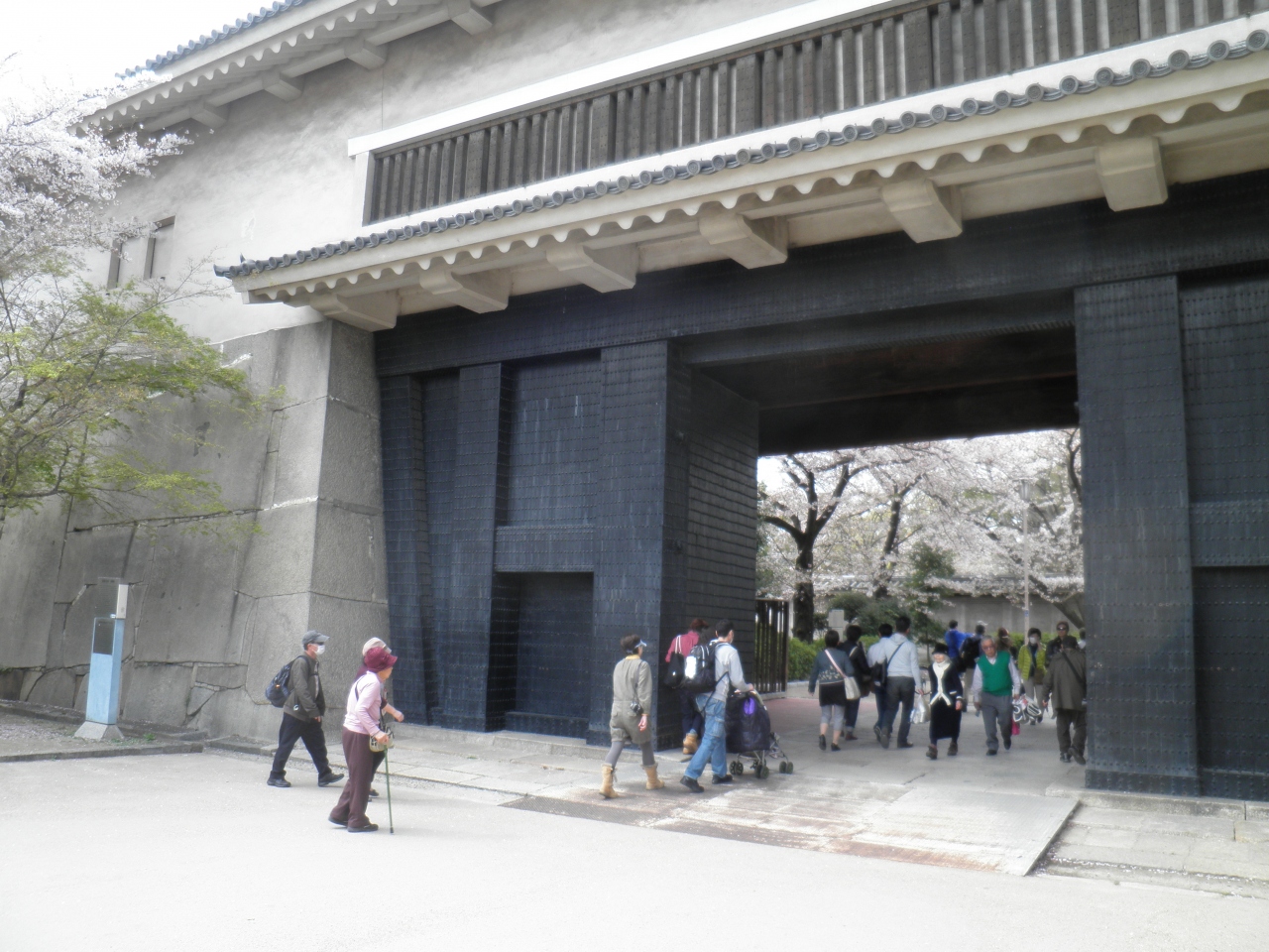 大阪城の敷地はかなり広いです。 数年前のガイドブックには、電気自動車が走ってるとかいてあったのですが、もう運行やめたのか、ちょうど花見客でいっぱいだからか見かけませんでした。 天守閣に辿り着くルートは、裏口がわりと坂が緩やかで、表口が急なので、裏から登って表から降りると楽なようです。