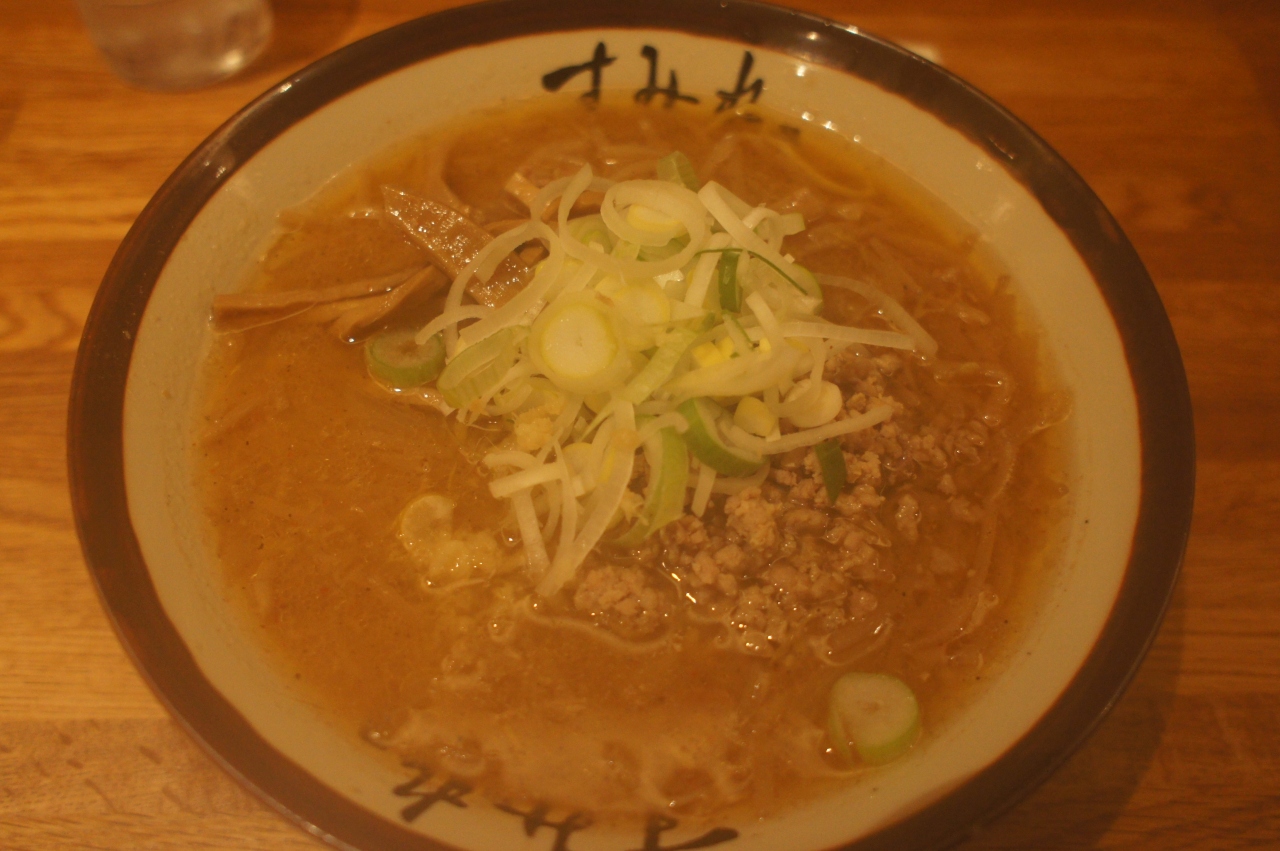 すみれは、すすきの交差点すぐの人気ラーメン店です。夜遅くまでやっているのですが、人気なので行列が絶えないお店。二階の入口まで上がる階段にも行列が続いていました。