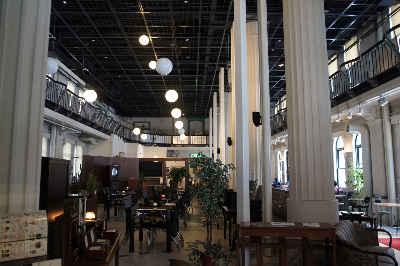 旧北海道拓殖銀行 小樽支店は、日銀通りを下ったところ。地元ナンバーワンだった金融機関だけに、建物としては旧日銀小樽支店よりずっと大きいです。今は、ホテルヴィブラントオタルというホテルになっていて、入りにくいなあと思っていたのですが、雪あかりの路の期間中は中で、写真展示をやっていて気軽に入ることが出来ました。すると、内部はなんとおしゃれでしょうか。ローマ風の柱が天井に向かって、美しく伸びていて壮観。これはいいものを見せてもらいました。